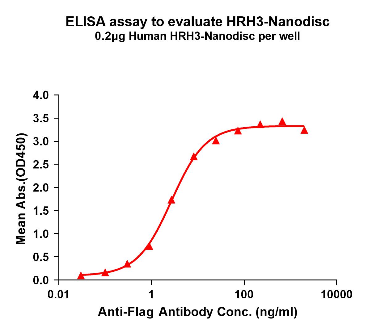 Figure 1. Elisa plates were pre-coated with Flag Tag HRH3-Nanodisc (0.2μg/per well). Serial diluted Flag monoclonal antibody solutions were added, washed, and incubated with secondary antibody before Elisa reading. From above data, the EC50 for Flag monoclonal antibody binding with HRH3-Nanodisc is 2.708ng/ml.