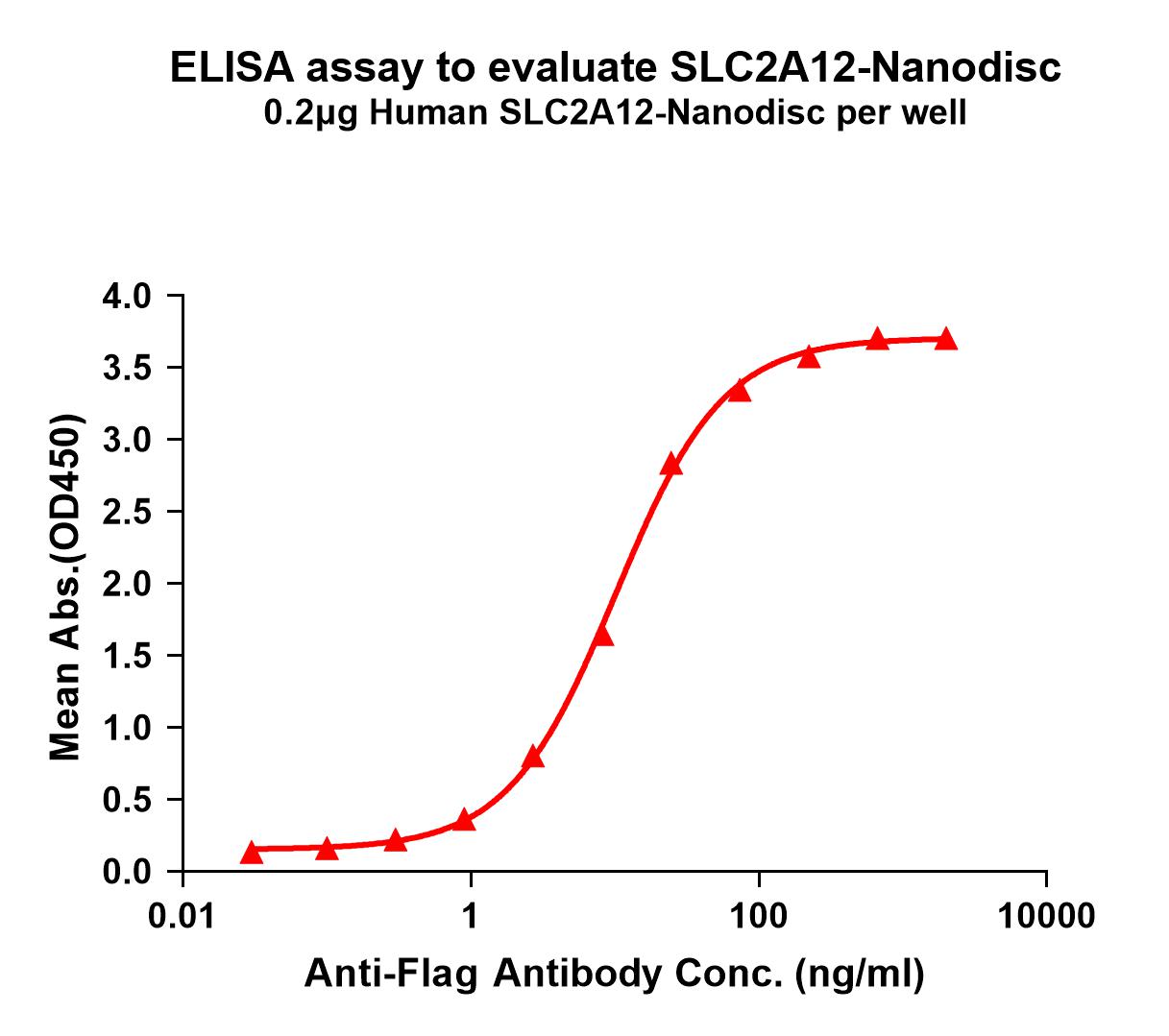 Figure 1. Elisa plates were pre-coated with Flag Tag SLC2A12-Nanodisc (0.2μg/per well). Serial diluted Flag monoclonal antibody solutions were added, washed, and incubated with secondary antibody before Elisa reading. From above data, the EC50 for Flag monoclonal antibody binding with SLC2A12-Nanodisc is 10.17ng/ml.