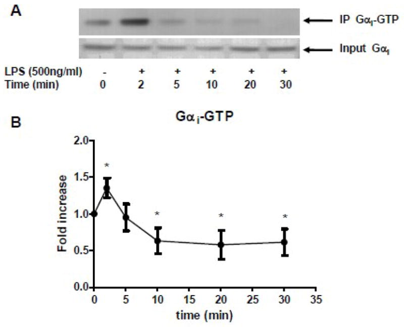 RAW 264.7 cells were stimulated with LPS (500ng/ml). (A) Gαi-GTP complex was immunoprecipitated and subjected to Western blot (top gel). The total Gαi proteins were shown in bottom gel. (B) The statistical analysis was performed on densitometry scan. Data are representative of seven independent experiments. *, p<0.05 compared to basal group.