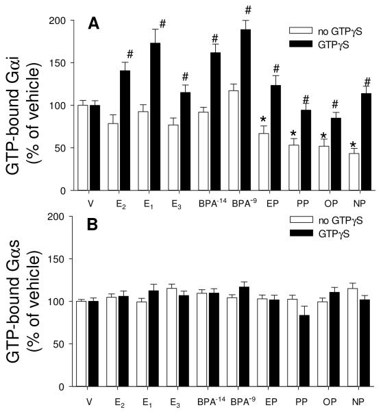 Cells were treated with vehicle (V), estradiol (E2), estrone (E1), estriol (E3), bisphenol A (BPA), ethylphenol (EP), propylphenol (PP), octylphenol (OP) and nonylphenol (NP) for 5 min, all estrogens at 1nM, except that BPA was additionally tested at 10 fM. GTP-bound Gαi (A) and Gαs (B) were measured by recognition with an Ab selective for these GTP-bound forms in the absence (white bar) or presence (dark bar) of 100μM GTPγS. Total Gαi and Gαs were also measured, but did not differ under any conditions of estrogen treatments (data not shown). For statistical annotations: For A *= statistical significance (P<0.05) from paired V control for the no GTPγS group. #= GTPγS-treated group statistical significance (P<0.05) from paired estrogen-treated levels; n=48 without, and n=32 with GTPγS treatment over 3 experiments. For B n=32 without and n=16 with GTPγS treatment over 2 experiments.