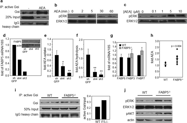 a, N18TG2 cells were treated with AEA (10 μm, 60 min), and active Gαi was immunoprecipitated (IP) and visualized by immunoblots. Immunoblots of 20% of total lysate (20% Input) and the heavy chain of the antibody (IgG heavy chain) are shown as controls for total expression of Gαi and precipitation efficiency, respectively. b, N18TG2 cells were treated with AEA (5 μm), and the phosphorylation level of ERK (pERK) at denoted times was monitored by immunoblots. c, N18TG2 cells were treated with denoted concentrations of AEA for 5 min, and the phosphorylation level of ERK was monitored by immunoblots. d, levels of FABP5 mRNA in N18TG2 cell lines expressing different levels of FABP5, measured by Q-PCR. Inset, immunoblots of FABP5 in N18TG2 cell lines expressing different levels of FABP5. e and f, rates of uptake (e) and hydrolysis (f) of AEA in N18TG2 lines stably expressing varying levels of FABP5. See “Experimental Procedures” for details. Data are mean ± S.D. (n = 3). *, p < 0.05, **, p < 0.01. g, levels of mRNA for FABP3, FABP5, and FABP7 in whole brains of WT and FABP5−/− mice, measured by Q-PCR. Data are mean ± S.D. n = 3. h, levels of AEA in whole brains of 12–14-week-old FABP5−/− male mice and WT littermates. n = 10/group. See “Experimental Procedures” for details. i, left, levels of active Gαi protein in hippocampus of two WT and two FABP5−/− mice, assessed by immunoblots following immunoprecipitation of active Gαi. Right, quantification of immunoblots. j, immunoblots of phospho-ERK (pERK) and phospho-AKT (pAKT) in hippocampus of two WT and two FABP5−/− mice.