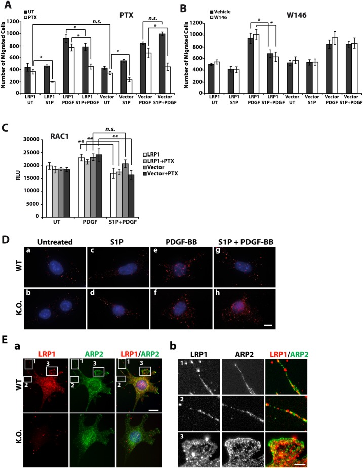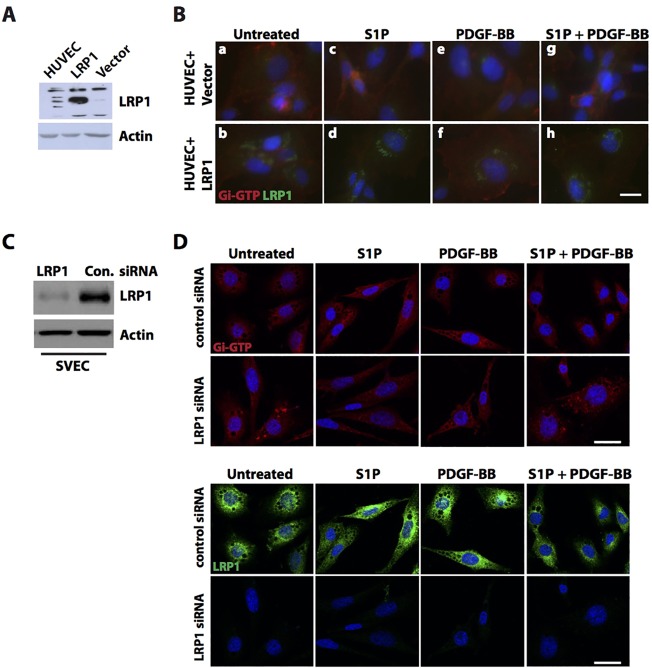 (A) HUVECs, as well as Lrp1-deficient fibroblasts stably retransfected with an LRP1 expression plasmid (LRP1) or with empty plasmid vector (Vector) were cultured. Whole cell lysates were subjected to western blotting against LRP1, with actin as a loading control. (B) HUVECs transiently transfected with an LRP1 expression plasmid (HUVEC+LRP1) or with the empty plasmid vector (HUVEC+Vector) were treated with 1 µM S1P and/or with 50 ng/ml PDGF-BB for 1 min or were left untreated and Gi activation was detected by immunocytochemistry. The cells were stained for activated Gi-GTP (red) and LRP1 (green), with DAPI as counterstain. (C) SVEC4-10 cells were transfected with siRNA targeted at the mouse Lrp1 sequence (LRP1 siRNA) or firefly luciferase sequence (control siRNA). Knockdown of LRP1 was assayed by western blotting from whole cell lysates. (D) Transiently transfected SVEC4-10 cells were treated with 1 µM S1P and/or 50 ng/ml PDGF-BB for 2 min or left untreated. The cells were immunostained for Gi-GTP (red) and LRP1 (green), with DAPI counterstain. Scale bars: 10 µm in B; 20 µm in D.