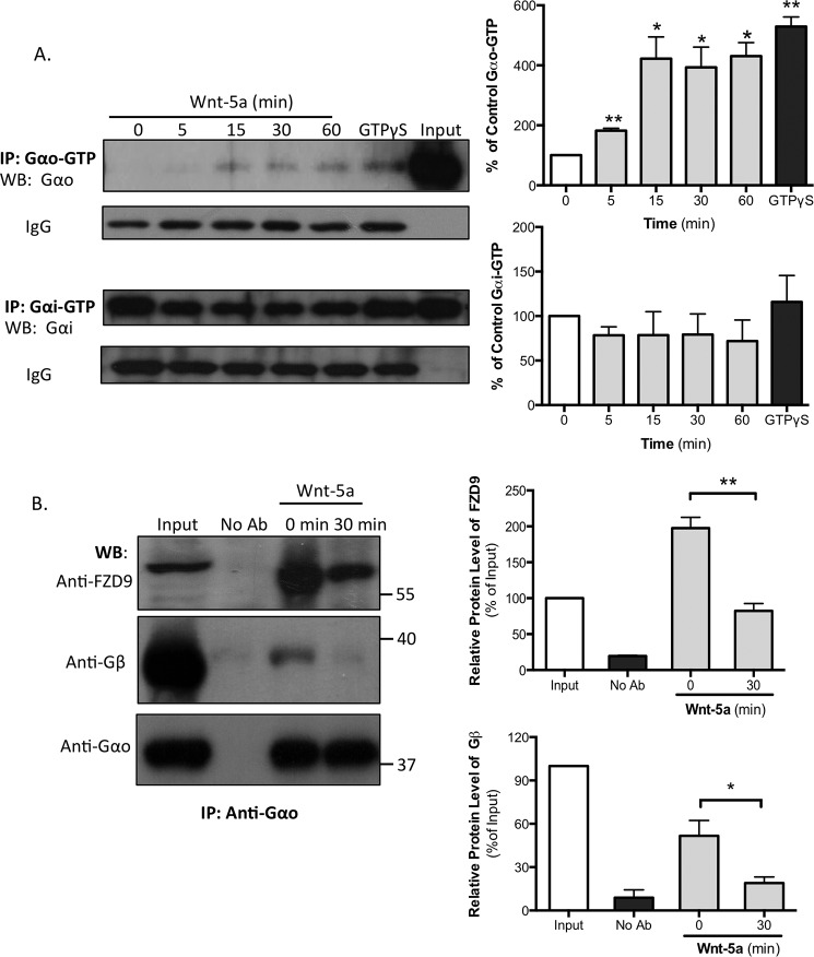 Wnt-5a increases the GDP/GTP exchange of the Gαo subunit, and FZD9 is associated with Gαo in DIV 14 hippocampal neurons.