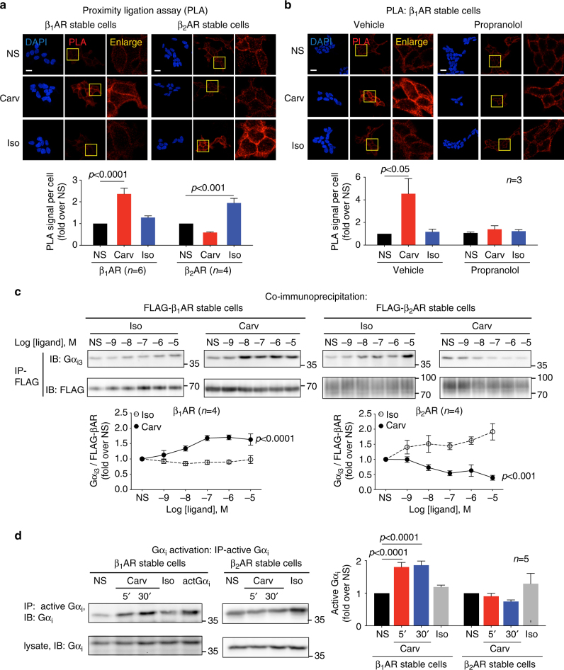 a In proximity ligation assay (PLA), cells were immuno-stained with Gαi antibody raised in mouse and β1AR (or β2AR) antibody raised in rabbit. The red PLA signal represents the protein interactions of Gαi and β1AR (or β2AR). The area in yellow squares are enlarged for better view. Carvedilol promoted Gαi recruitment to β1ARs, but not to β2ARs. Scale bar = 20 μm. b β1AR stable cells were pretreated with vehicle or 10 μM propranolol for 30 min. The βAR antagonist propranolol blocked the carvedilol response, suggesting that β1AR–Gαi coupling is induced by the binding of carvedilol to the β1AR orthosteric binding pocket. Scale bar = 20 μm. c The effect of carvedilol and isoproterenol on Gαi recruitment was confirmed with co-immunoprecipitation assays. FLAG-tagged β1ARs or β2ARs were immunoprecipitated with anti-FLAG M2 beads, and Gαi3 was detected with its specific antibody by western blot. d Carvedilol specifically activated Gαi in β1AR stable cells. Cells were transfected with Gαi2. 48 h after transfection, cells were treated with 10 μM carvedilol for 5 min or 30 min, or 10 μM isoproterenol for 5 min. Activated Gαi was immunoprecipitated with an antibody specifically recognizing the active form of Gαi, and immunoblotted with an Gαi antibody. In the middle lane marked as actGαi, cells were transfected with constitutively active Gαi2, serving as positive control. Carvedilol stimulation activated Gαi in β1AR stable cells, but not in β2AR stable cells. Data represent the mean ± SEM for n independent experiments as marked on the figure. Statistical significance vs. unstimulated cells (NS) was assessed using one-way ANOVA with Bonferroni correction