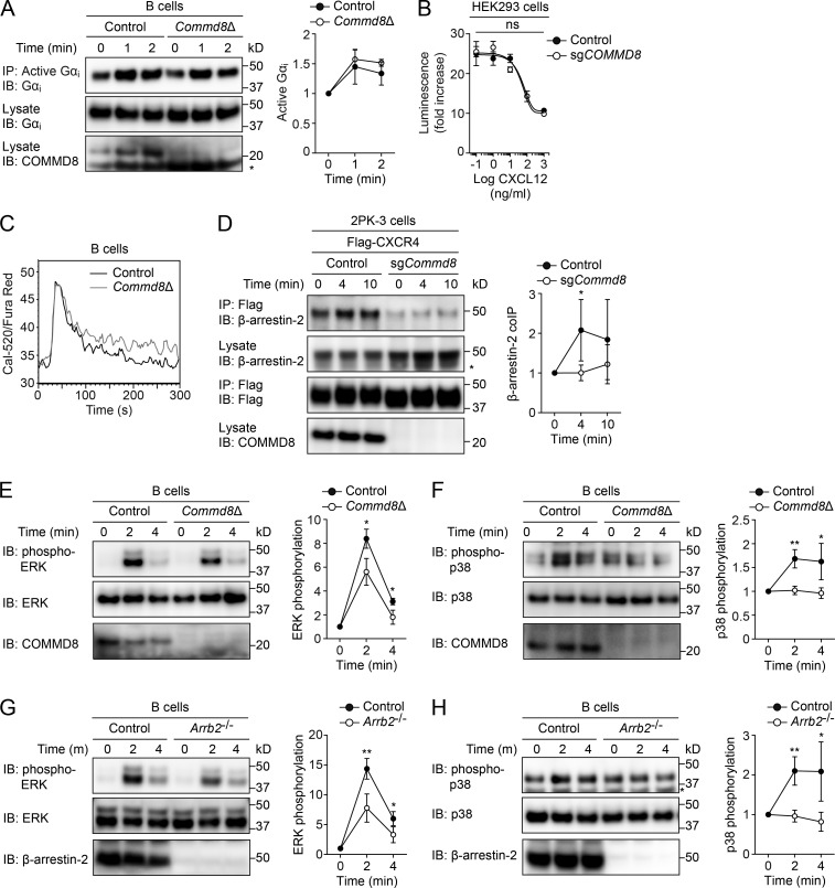 (A) IB analysis for Gαi activation induced by CXCL12 in control and Commd8Δ B cells. (B) CXCR4-mediated inhibition of cAMP production was assessed by the GloSensor reporter in vector-transfected control and COMMD8-deficient (sgCOMMD8) HEK293 cells expressing Flag-tagged CXCR4. The amounts of cAMP are plotted as fold increases of luminescence over the levels in unstimulated cells. Data are shown as the mean ± SD of triplicates and representative of three independent experiments. (C) Intracellular calcium responses to CXCL12 in control and Commd8Δ B cells. Responses are plotted as the ratio of Cal-520 to Fura Red fluorescence. Data are representative of two independent experiments. (D) IP assay for the recruitment of endogenous β-arrestin-2 to Flag-tagged CXCR4 in vector-transfected control and COMMD8-deficient (sgCommd8) 2PK-3 cells after stimulation with CXCL12. (E–H) IB analysis for the phosphorylation of ERK (E and G) and p38 (F and H) in Commd8Δ (E and F) and Arrb2−/− (G and H) B cells after stimulation with CXCL12. B cells from littermate Commd8f/+Mb1Cre/+ and Commd8f/fMb1+/+ (E and F) or Arrb2+/+ (G and H) mice served as the control. Error bars represent the mean ± SD of three (A and E–H) or four (D) independent experiments, and representative blots are shown. *, P < 0.05; **, P < 0.01; ns, not significant. The P values were obtained by two-tailed unpaired (A and D–H) or paired (B) t test. Asterisk indicates nonspecific bands (A, D, and H). coIP, coimmunoprecipitation.