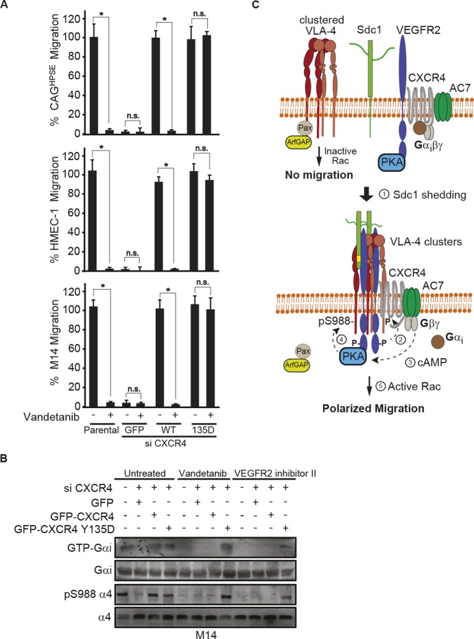 The CXCR4 Y135D phosphomimetic mutant rescues the effects of VEGFR2 inhibition. (A,B) CAGHPSE, HMEC-1 or M14 cells were transfected with GFP alone, GFP–CXCR4 WT, or GFP–CXCR4 Y135D together with siRNA targeting 3′UTR of endogenous CXCR4 for 48 h. (A) 16 h transfilter cell migration assay towards 100 µg/ml IIICS was performed in the absence or presence of 10 µM vandetanib. Migrated cells were quantified and graphed as the mean±s.d. from three independent experiments. All data were compared using the unpaired one-tailed t-test. *P<0.01, n.s., not significant. (B) M14 cell lysates were subjected to immunoprecipitation with anti-GTP-Gαi and probed for Gαi. Whole-cell lysates were analyzed by immunoblotting for Gαi or α4 integrin (total or pS988). (C) Model depicting how paxillin bound to VLA-4 causes inherent inhibition of Rac GTPase at this site due to its binding of ArfGAP (Nishiya et al., 2005). VEGFR2 forms a complex with CXCR4, AC7 and PKA, but this complex is inactive unless Sdc1 is shed. Trimming of the HS chains on Sdc1 by HPSE facilitates its shedding by MMP9 (Purushothaman et al., 2010; Yang et al., 2007). Sdc1 freed of its membrane anchorage couples VEGFR2 and its integrin phosphorylation machinery to VLA-4 clusters. VEGFR2 activated by this clustering event phosphorylates CXCR4 at Y135, activating its heterotrimeric G-protein. Gβγ freed of Gαi activates AC7, generating cAMP that activates PKA. PKA phosphorylation of the α4 integrin cytoplasmic domain at S988 dissociates paxillin–ArfGAP from VLA-4, allowing local lamellipodium formation and directed cell migration.