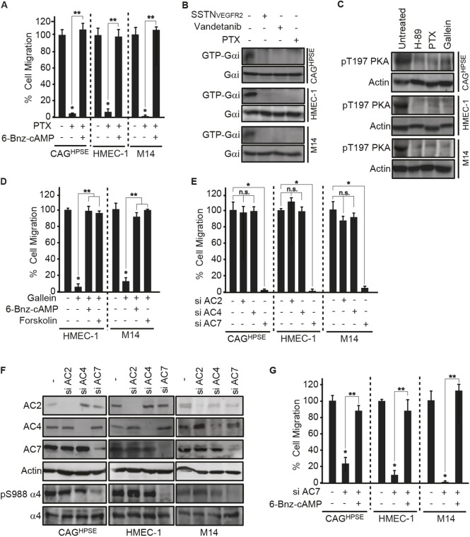Gβγ-dependent adenylate cyclase 7 activation is required for PKA activation. (A) 16 h transfilter migration assays towards 100 µg/ml IIICS were performed with CAGHPSE, HMEC-1 or M14 cells in the absence or presence of 10 µg/ml pertussis toxin (PTX), with or without 100 µM 6-Bnz-cAMP. Migrated cells were quantified and graphed as the mean±s.d. from three independent experiments. All data were compared using the unpaired one-tailed t-test. *P<0.01 against untreated parental cells; **P<0.01 between treatments. (B) CAGHPSE, HMEC-1 or M14 cells were plated on 100 µg/ml IIICS with 30 µM SSTNVEGFR2, 10 µg/ml vandetanib or 10 µg/ml PTX for 2 h. Whole-cell lysates were subjected to immunoprecipitation with an anti-GTP-Gαi antibody and immunoblotting for Gαi. (C) CAGHPSE, HMEC-1 or M14 cells were plated on 100 µg/ml IIICS with 10 µM H-89, 10 µg/ml PTX or 20 µM gallein for 2 h. Lysates were analyzed by immunoblotting for PKA pT197 or β-actin as a loading control. (D) 16 h transfilter migration assays towards 100 µg/ml IIICS were performed with HMEC-1 or M14 cells in the absence or presence of 20 µM gallein with or without 100 µM 6-Bnz-cAMP or 30 µM forskolin. Migrated cells were quantified and graphed as the mean±s.d. from three independent experiments. All data were compared using the unpaired one-tailed t-test. *P<0.01 against untreated parental cells; **P<0.01 between treatments. (E,F) CAGHPSE, HMEC-1 or M14 cells were transfected with siRNA against AC2, AC4 or AC7 for 48 h, before performing migration and immunoblotting assays. (E) 16 h transfilter migration assays towards 100 µg/ml IIICS were performed with CAGHPSE, HMEC-1 or M14 cells. Migrated cells were quantified and graphed as the mean±s.d. from three independent experiments. All data were compared using the unpaired one-tailed t-test. *P<0.01 against untreated parental cells; n.s., not significant between treatments. (F) Cell lysates were analyzed by immunoblotting for AC2, AC4, AC7, α4 integrin, α4-pS988 and β-actin as a loading control. (G) CAGHPSE, HMEC-1 or M14 cells were transfected with or without AC7 siRNA for 48 h and then 16 h transfilter cell migration assays towards 100 µg/ml IIICS were performed in the absence or presence of 100 µM 6-Bnz-cAMP. Migrated cells were quantified and graphed as the mean±s.d. from three independent experiments. All data were compared using the unpaired one-tailed t-test. *P<0.01 against untreated parental cells; **P<0.01 between treatments.