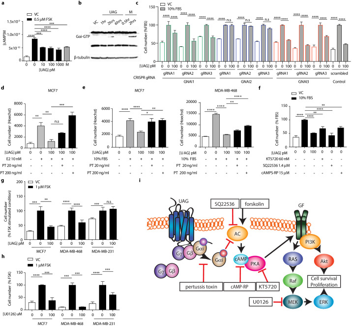 (a) Unacylated ghrelin (UAG; 10–1000 pM) inhibits the forskolin-stimulated production of cAMP in MCF7 cells (3–4 replicates/group). (b) UAG (100 pM) stimulates activation of Gαi (three replicates/group). (c) UAG (100 pM) suppresses the growth of CRISPR GNAI1 and GNAI3 KO cells, but not GNAI2 KO MCF7 cells, suggesting Gαi2-coupled GPCR-mediated effects. Suppression of (d) estradiol- or (e) serum-stimulated breast cancer cell growth with UAG (100 pM) is prevented in the presence of Gαi inhibitor, pertussis toxin (20 ng/ml, 200 ng/ml; three replicates/group). (f) PKA inhibitor (KT5720), adenylyl cyclase inhibitor (SQ22536) or cAMP antagonist (cAMPS-RP) suppress the serum-stimulated growth of MCF7 cells (three replicates/group). (g) UAG (100 pM) inhibits the forskolin-stimulated growth of MCF7 and MDA-MB-468 cells, but not MDA-MB-231 (three replicates/group). (h) U0126 (MEK inhibitor) inhibits the forskolin-stimulated growth of MCF7, MDA-MB-468 and MDA-MB-231 cells (three replicates/group). (i) A model summarizing the putative mechanism of action of UAG in breast cancer cells and compounds used to dissect mechanism of action. Data represent mean ± SEM. Experiments were repeated at least twice. UAG: unacylated ghrelin; VC: vehicle control; FBS: fetal bovine serum; E2: estradiol; PT: pertussis toxin; M: melatonin; FSK: forskolin.