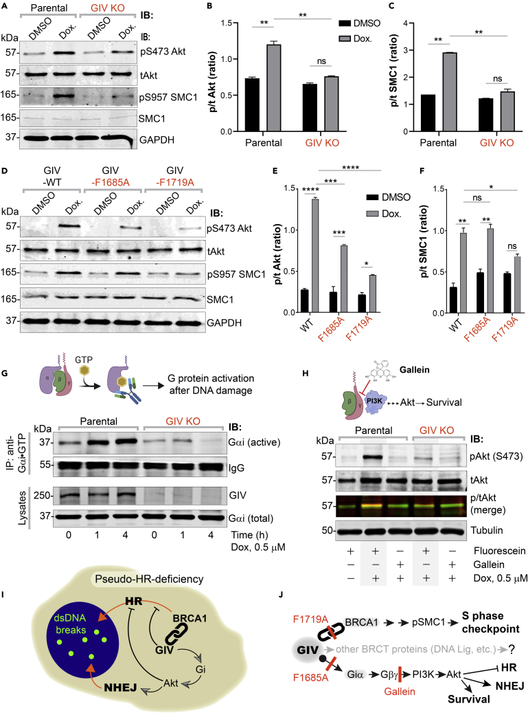 (I and J) Summary of findings showing how GIV skews the choice of repair pathway from HR to NHEJ, partly via sequestration of BRCA1 away from the sites of dsDNA breaks and in part via the enhancement of Akt via the Gi→“free” Gβγ→Class I PI3K pathway. The tools (mutants and chemical inhibitors) used in this work are highlighted in red.