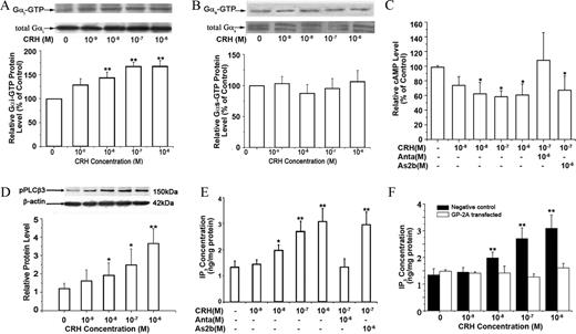 A and B, Effects of CRH on GTP-bound Gi protein (A) and GTP-bound Gs protein (B). Representative protein bands of GTP-bound Gi protein and Gs protein are on the top of histograms (n = 3 cultures). C, Effect of CRH on cAMP production in TL cells (n = 4 cultures). D, Effect of CRH on phosphorylated PLCβ3 (pPLCβ3). Representative protein bands of pPLCβ3 are on the top of histograms (n = 3 cultures). E, Effect of CRH on intracellular IP3 concentration (n = 3 cultures). F, Effect of inhibitory peptide of Gq protein GP antagonist-2A on CRH-induced IP3 production. Cells were transfected with a small inhibitory peptide of Gq protein GP antagonist-2A or negative control peptide for 2 h and treated with CRH at the indicated doses for 10 min, and then levels of intracellular IP3 were analyzed by ELISA (n = 3 cultures). Data are expressed as mean ± SEM. *, P < 0.05; **, P < 0.01 vs. vehicle control.