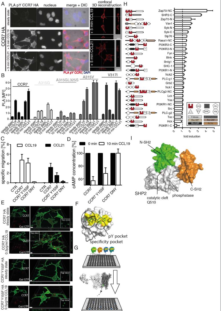 (A) Tyrosine phosphorylation of CCR7 upon ligand binding. HEK293 cells stably expressing HA-tagged CCR7 were stimulated or not with 0.5μg/ml CCL19 or CCL21 and pTyr of CCR7 was determined by PLA using anti-CCR7 (SAB4500329) and anti-phosphoTyr (clone 4G10) specific antibodies. One representative experiment out of 4 is shown. (B) Src preferentially tyrosine phosphorylates oligomeric CCR7. HEK293 cells expressing either wild-type CCR7 or oligomer-defective or super-oligomerizing CCR7 mutants were stimulated or not with 0.5 μg/ml CCL19 or CCL21 for 5 or 10 min. CCR7 pTyr was assessed by PLA, visualized by fluorescent microscopy and mean fluorescence intensities +/- SEM of 3 independent experiments were quantified by ImageJ. (C) Cell migration towards CCL19 and CCL21 in 3D is hampered in cells expressing a phosphorylation-defective mutant (CCR7 Y155F) and abolished by a G-protein-coupling-deficient mutant (CCR7 DNY). Specific cell migration of 300-19 CCR7 transfectants in response to 0.5g/ml CCL19 or CCL21 was determined in 3D Matrigel migration assays. Mean values ± SEM, n=3. (D,E) G-protein coupling is not affected in the CCR7 Y155F mutant. G-protein activation in HEK293 cells expressing CCR7 variants was assessed using a cAMP competition ELISA (D; mean values +/-SEM, n=3) or visualized by confocal microscopy using an antibody specifically recognizing active, GTP-bound Gαi (E; one of 3 experiments). Scale bars: 10μm. (F) Interphase of the phosphopeptide (green) with SHP2 N-SH2 (PDB 3TL0) showing the typical position of the pY binding and specificity pocket (yellow) of the SH2 domain. (G) Schematic representation of the ELISA-based SH2-domain interaction screen. SH2-domains of distinct signaling molecules fused to GST were coated on microtiter plates. Cell lysates containing v-Src-driven tyrosine phosphorylated CCR7 or nontransfected control lysates were used to screen for interactions with the coated SH2-domains as specified in the method section of the supplement. (H) Schematic representation of the SH2- domain (highlighted in red) bearing signaling molecules used for the screen and their interaction with pTyr CCR7. Background signals obtained from cell lysates incubated on GST-coated plates were subtracted and the ratio of nontransfected to v-Src transfected HEK293 cells stably transfected with CCR7 was calculated and indicated as fold induction. Mean values +/- SEM of triplicates of 2 experiments are shown. (I) Surface representation of autoinhibited SHP2 based on its crystal structure (PDB 2SHP) with the two SH2 domains highlighted in green and orange, the phosphatase domain in white.