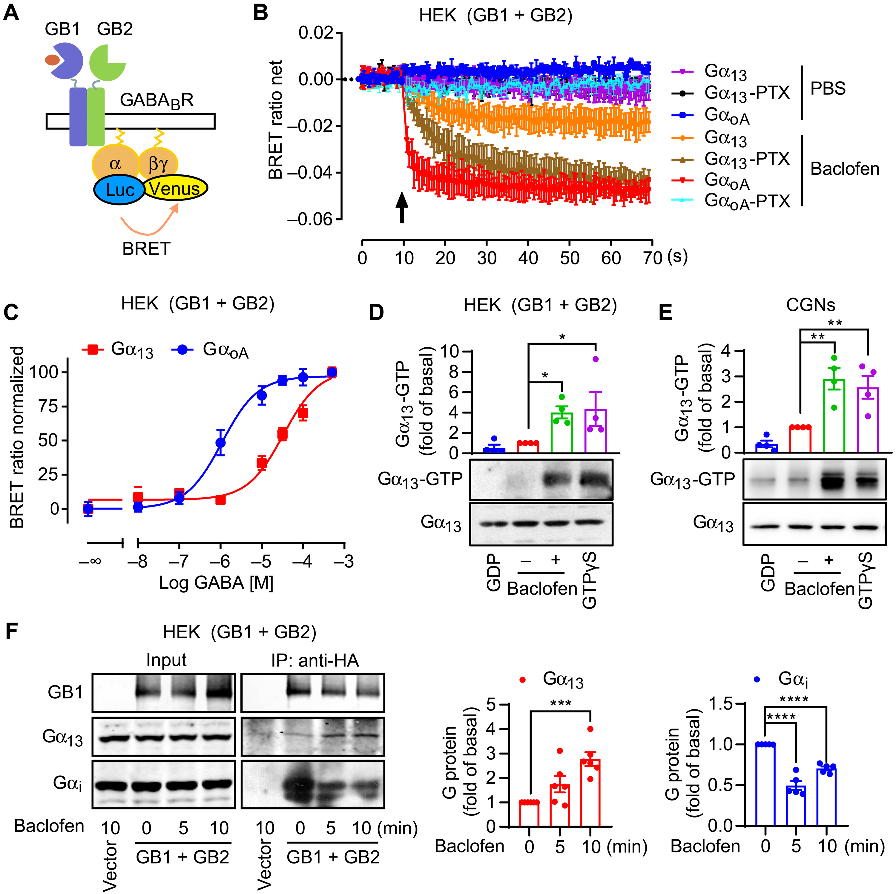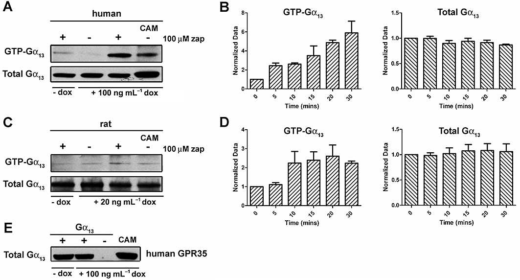 Gα13 activation assays were performed using a Gα13 activation assay kit (NewEast Biosciences) according to the manufacturer’s instructions. Flp-In™ T-REx™ 293 cells able to express FLAG-tagged human GPR35-eYFP or FLAG-tagged rat GPR35-eYFP in response to doxycycline were induced and incubated for varying times with either vehicle or agonist. Cells were immediately washed with ice-cold phosphate-buffered saline and prepared in ice-cold lysis buffer. Lysates were incubated with the anti-active-state Gα13 mouse monoclonal antibody. Gα13-GTP was then recovered using protein A/G agarose and the precipitated Gα13-GTP was detected following SDS-PAGE by immunoblot analysis using a conformation insensitive anti-Gα13 rabbit polyclonal antiserum. Parallel immunoblots of cell lysates with the polyclonal anti-Gα13 antiserum assessed total cell levels of this G protein.