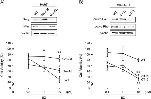 ( A ) The cytotoxicity of bortezomib (10 μM, 24 h treatment) was assessed in Huh7 cells that had been stably transfected with a constitutively active mutant of Gα 12 or Gα 13 (Gα 12 QL or Gα 13 QL). Data represent the mean ± SE of three independent experiments (* P < 0.05, ** P < 0.01, significant compared with wild-type (WT) cells treated with bortezomib at respective concentrations). Immunoblottings for Gα 12 or Gα 13 verified transfection efficiency. ( B ) The cytotoxicity of bortezomib was measured in SK-Hep1 cells that had been transfected with Gα 12 or Gα 13 minigene (CT12 or CT13). Data represent the mean ± SE of three independent experiments (* P < 0.05, ** P < 0.01, significant compared with wild-type cells treated with bortezomib at respective concentrations). Immunoblottings for active Gα 13 or active Rho confirmed transfection efficiency of the minigenes. Equal loading of proteins was confirmed by immunoblottings for β-actin. Results were confirmed by three independent experiments.