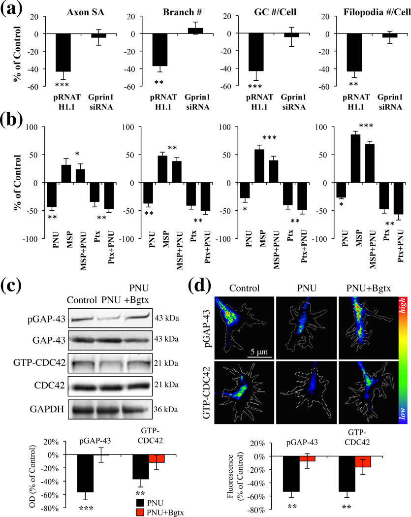 α7 mediated inhibition of axon growth is dependent on a Gprin1 pathway. (a) An analysis of axon and GC morphology in cells treated with 10 µM PNU. Values are based on average percent change in axon growth from control cells (cells transfected with the same plasmid but treated with 0.1% DMSO). (b) An analysis of axon and GC morphology in cells treated with: PNU (10 µM); Ptx (1 µM), mastoparan (30 µM) Values are based on average change in axon growth from control cells which were treated with 0.1% DMSO alone. (c–d) Analysis of pGAP-43 and GTP-CDC42 expression within hippocampal neurons treated with PNU (10 µM), PNU+Bgtx (50 nM), or Control (0.1% DMSO) for 60 min in MP (c) and GCs (d). Immunofluoresecence signal in d represented as a heat map.