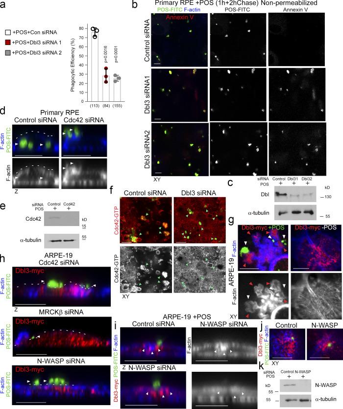 Cdc42 drives protrusion induction and cup maturation. (a–c)…. (f) Active Cdc42-GTP at nascent protrusions is inhibited by siRNA-mediated knockdown of Dbl3. Note, green arrowheads highlight POS-membrane bound sites.