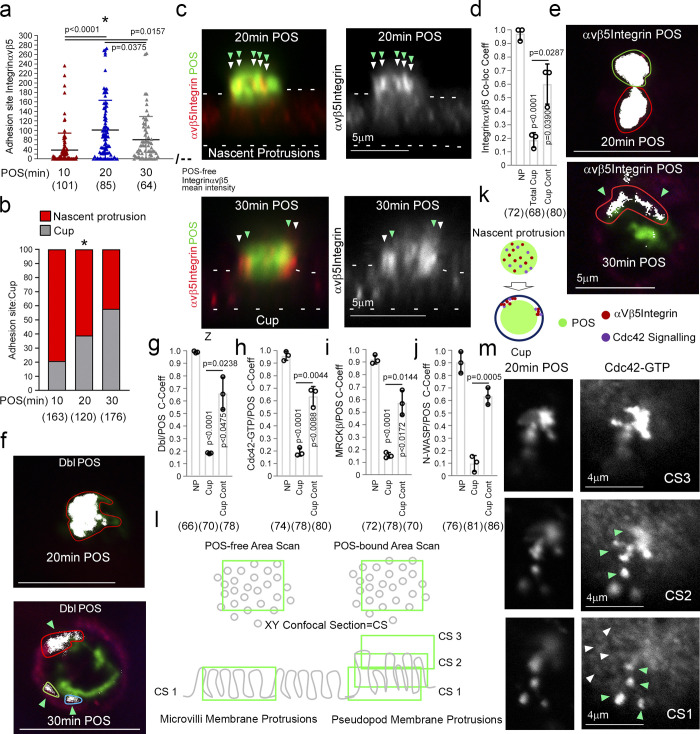 (a–j) Integrin αvβ5 and Cdc42 signaling components recruitment to POS adhesion sites upon 10 (early adhesion), 20 (membrane deformation and protrusions), and 30 min (cups). Note, POS binding to the integrin αvβ5 receptor induces rapid colocalization of Dbl3, Cdc42-GTP, MRCKβ, and N-WASP with the POS–integrin complex. Nascent protrusions (white arrowheads) display almost complete colocalization of Cdc42-signaling components with POS (highlighted by green arrowheads) whereas in the cup conformation (white arrowheads) colocalization occurs at discrete contact sites (green arrowheads) at the cup–POS interface. (k) Schematic diagram illustrating almost complete co-localization of integrinαvβ5 and Ccd42-signaling proteins with POS at nascent protrusions and partial co-localization at POS-cup adhesion sites. (l) Schematic diagram illustrating method of quantifying mean labeling intensity of protrusion proteins using Cdc42-GTP as an example. Confocal xy sections were scanned at the apical membrane surface of RPE cells (Confocal Scan 1, CS1), both unattached and POS attached. Since protrusions are at an increased height compared to normal apical brush border microvilli, further serial scans were taken as appropriate to cover the protrusion length and values were averaged. (m) At CS1, Cdc42-GTP enrichment is observed at single protrusions (green arrowheads) at a similar diameter to surrounding non-POS attached brush border structures (white arrowheads). Quantifications: means ±1SD of n = 3 independent experiments; indicated are the total number of cells analyzed and P values derived from t tests, except for the scatter plot in panel a where the median and upper and lower quartiles are highlighted, and n values represent number of cells collected from three independent experiments, and significance was tested with an ANOVA test.