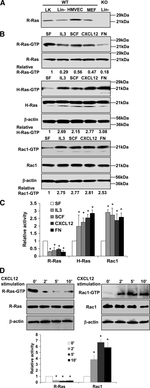 A, expression of R-Ras in HPCs. Lin− and Lin−/c-Kit+ (LK) cells were harvested from WT or knock-out (KO) mouse BM. Expression of R-Ras of the indicated samples was examined by Western blotting. B, R-Ras, H-Ras, and Rac1 activities under various stimulatory conditions in Lin− cells. Lin− cells from WT mice under various stimulatory conditions were subjected to effector domain pulldown assays, and the activities of R-Ras, H-Ras, and Rac1 were examined. Blotting of the respective total cell lysates was carried out in parallel. Relative amounts of GTP-bound form of the GTPases were quantified by densitometry and normalized to the nonstimulated control. Data are representative of three independent experiments. C, relative activities quantified by densitometry and normalized to the nonstimulated control (mean ± S.D. from three independent experiments). D, R-Ras and Rac1 activities under CXCL12 stimulation at multiple time points (mean ± S.D. (error bars) from three independent experiments). *, p < 0.05.