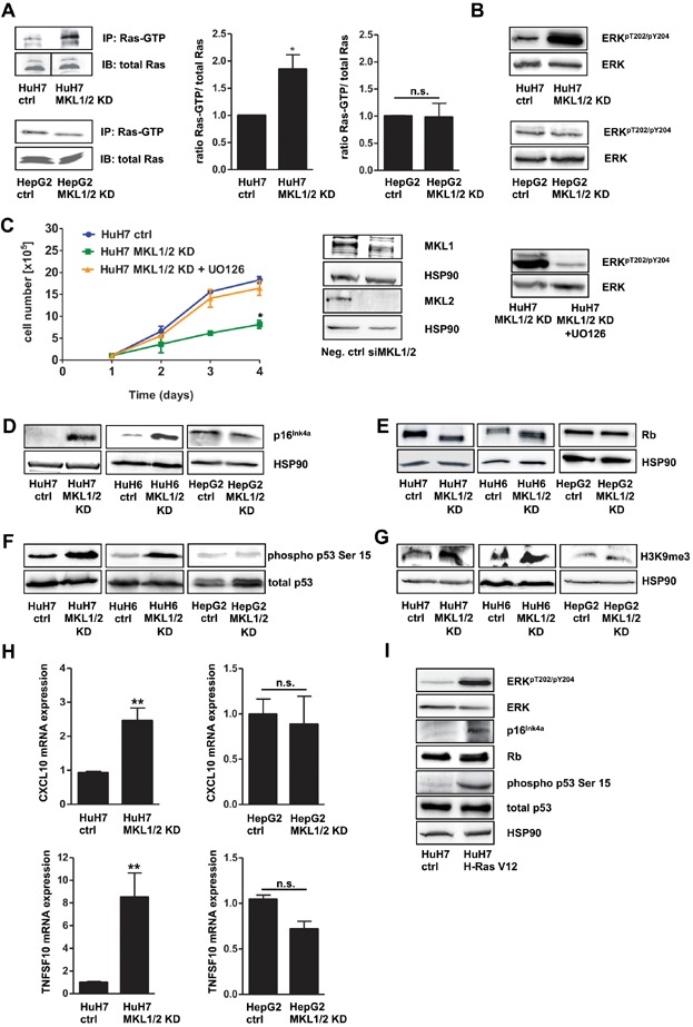 - HuH7, HuH7 MKL1/2 KD, HepG2 and HepG2 MKL1/2 KD cells were immunoprecipitated with anti-active Ras antibody and immunoblotted with anti-Ras antibody. Equal amounts of lysates were directly immunoblotted with anti-Ras antibody. The black line delineates a boundary caused by juxtaposing lanes that were non-adjacent in the same gel. The relative ratio of active Ras versus total Ras was quantitated and graphically depicted on the right. Values are mean ± SD; *p = 0.046.