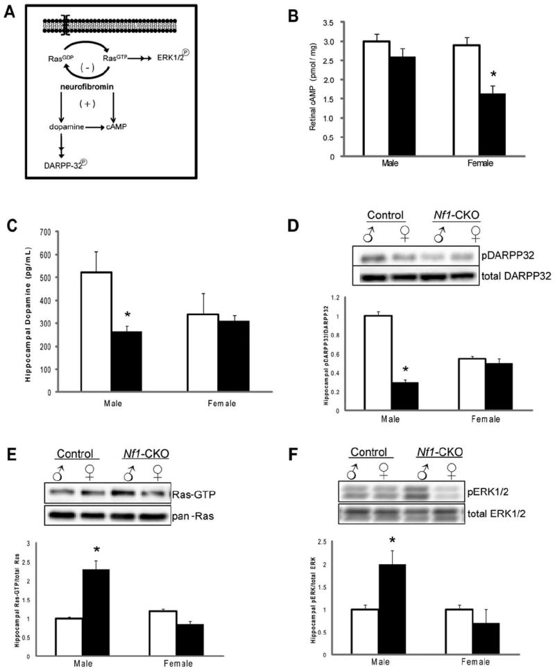 (A) Established molecular pathways regulated by the NF1 gene product, neurofibromin. (B) Retinal cyclic adenosine monophosphate (cAMP) levels were reduced by 47% in female Nf1-CKO mice relative to female controls. No change in retinal cAMP levels was observed in male Nf1-CKO mice relative to male controls. (C) Hippocampal dopamine levels were reduced 2-fold in male Nf1-CKO mice compared to male controls. No differences were observed in female Nf1-CKO mice relative to female controls. (D) DARPP32 phosphorylation was reduced in the hippocampus of Nf1-CKO male, but not female, mice. (E, F) Densitometric quantification reveals increased active (guanosine triphosphate [GTP]-bound) Ras (Ras-GTP levels relative to total Ras; E) and ERK (phospho-ERK1/2 relative to total ERK1/2; F) activation in male, but not female, Nf1-CKO hippocampi relative to controls. *p <0.05.