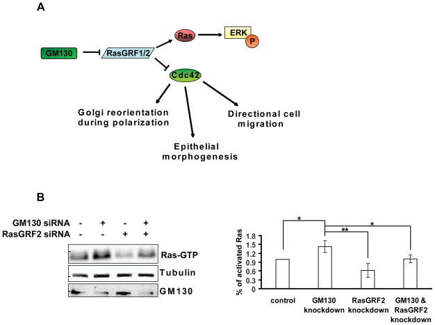 (A) Working model: GM130 acts as a suppressor of RasGRF activity, thereby modulating the activities of Ras and Cdc42. According to this model, the knockdown of GM130 results in increased Ras activation and decreased Cdc42 activation. (B) HepG2 cells were transfected with the indicated siRNAs. After 72 h, cells were lysed and Ras pull-down was performed using GST-RBD. The eluate form the beads was subjected to SDS-PAGE followed by immunoblotting with a pan-Ras antibody (Ras-GTP). 5% of the original lysate was subjected to SDS-PAGE followed by immunoblotting against tubulin and GM130. Bar graph represents a quantification of the amount active Ras (Ras-GTP) normalized to tubulin. Results are means ± SD from three independent experiments. Asterisks indicate statistically significant differences tested using ANOVA with Newman-Keuls multiple comparison test (*p<0.05; ** p<0.01).
