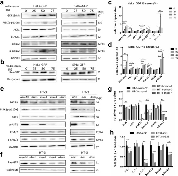GDF15 induced activation of AKT1 and ERK1/2 in human cervical cancer cell lines. GDF15, PI3K, AKT/p-AKT1, and Erk1/2/p-Erk1/2 were determined by western blotting and Ras-GTP was by immunoprecipitation. Western blotting of cell lysates from HeLa-GFP and SiHa-GFP cells which were incubated with 0%, 25%, 50% and 75% conditioned medium for 24 h (a and b) and the quantitative analysis are shown (c and d). Western blotting of cell lysates from HT-3-crispr-GDF-15 and HT-3-shGDF15 and their control cell lines (e and f) and the quantitative analysis are shown (g and h). N: nuclear protein; M: medium protein. The data were shown as the mean ± SD of three independent experiments. *p < 0.05, **p < 0.01 vs. control using One-Way ANOVA