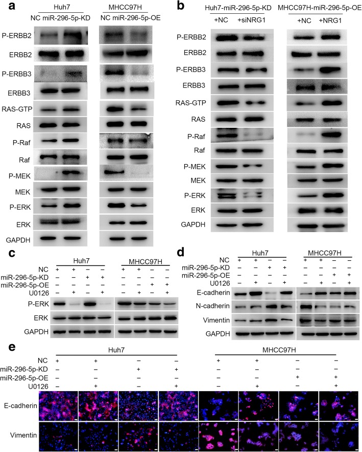 (a) The levels of ERBB2, ERBB3 and RAS/MAPK signaling-related proteins in miR-296-5p-KD Huh7, miR-296-5p-OE MHCC97H cells and their corresponding control cells. (b) The protein levels of ERBB2, ERBB3 and RAS/MAPK signaling-related molecules in siNRG1-transfected miR-296-5p-KD Huh7 cells, NRG1-expressing plasmids transfected miR-296-5p-OE MHCC97H cells and their counterparts. The protein expressions of P-ERK (c) and EMT markers (d and e) in miR-296-5p-KD Huh7, miR-296-5p-OE MHCC97H cells and their corresponding control cells after U0126 treatment