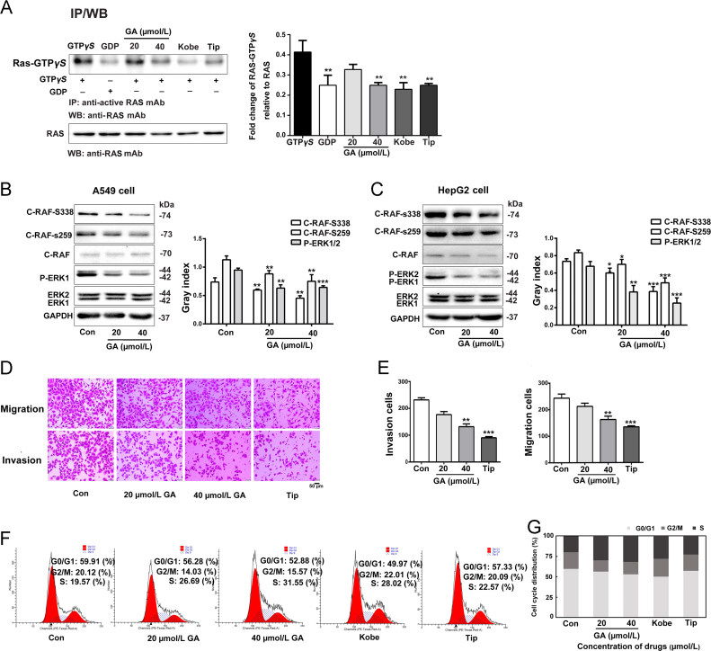 GA inhibits GTP binding and the activation of downstream effectors. (A) GA dose-dependently inhibits GTP binding and the activation of downstream effectors in vitro. (B) and (C) Western blots showing the levels of activated downstream effectors, c-RAF phosphorylated at S338 and S259 and phosphorylated ERK1/2 levels, in A549 cells and HepG2 cells after GA treatment. GAPDH expression was used as an internal control for normalization. The assay was performed three times, Error bars indicate means ± S.D. (*P < 0.05, **P < 0.01, ***P < 0.001 compared to the control). (D) and (E) A549 cells were cultured with 20 or 40 µmol/L GA. Migration (upper panel) and invasion (lower panel) were investigated using Transwell and Matrigel assays (n = 5), scale bar: 50 µm. (F) and (G) PI staining was performed to investigate the effect of GA on the cell cycle. Cells were treated with GA (20 or 40 µmol/L) for 24 h and then stained with PI. GA induced S phase arrest in A549 cells. Histogram shows the percentage of cells in G0/G1, G2/M and S Phase (n = 3).