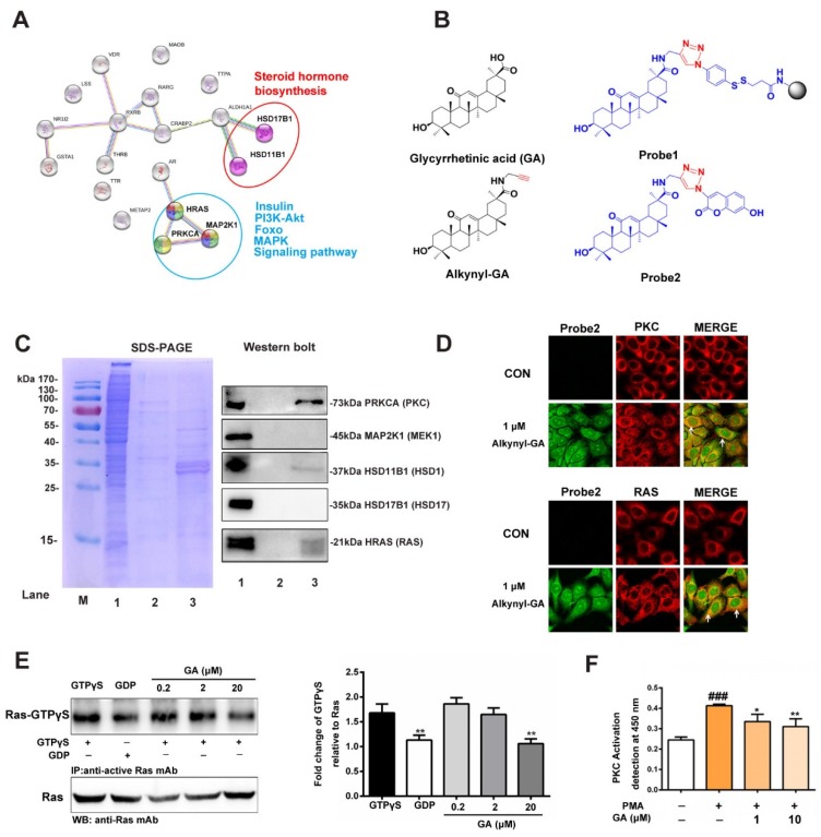 A New East Assay Kit (NewEast Biosciences, Wuhan, China) was used for Ras detection according to the manufacturer’s instructions. Briefly, approximately 80–90% confluent cultured cells (10-cm plate) were stimulated with GA (0.2, 20 or 20 µM) for 6 h. Then, the culture media was aspirated, and 500 µL of the assay/lysis buffer was added to the cells, and it was incubated on ice for 10–20 min. The lysates were clarified by centrifugation for 10 min (12,000·g, at 4 °C). The GTPγS- and GDP-bound proteins served as positive and negative controls, respectively. The cell extracts were divided into two tubes, and 20 µL of 0.5 M EDTA was added. Five microliters of GTPγS was added to the positive control, and 5 µL of GDP was added to the negative control. The tubes were incubated at 30 °C for 30 min, and the loading was terminated by placing the tubes on ice and then adding 60 mM MgCl2. Then, an antiactive Ras monoclonal antibody (1 µL) was added to each tube. A resuspended bead slurry was quickly added to each tube. Then, the tubes were incubated at 4 °C for 1 h with gentle agitation. The beads were pelleted by centrifugation for 1 min at 5000·g. The supernatant was aspirated and discarded, and the beads were washed 3 times with the assay/lysis buffer. The tubes were boiled for 5 min prior to the SDS-PAGE and western blot analyses.
