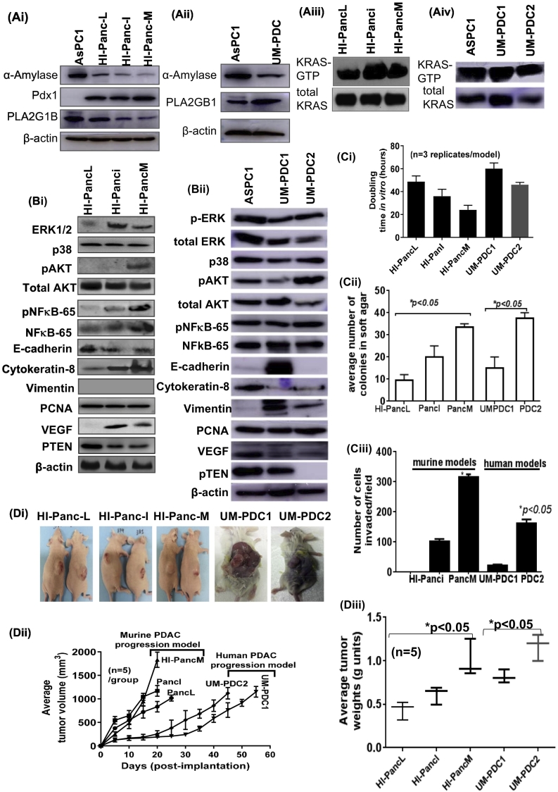 (A) Immunoblot images showing the expression of (Ai-Aii) pancreatic markers (α-Amylase, Pdx1, and PLA2G1B) and (Aiii-Aiv) K-ras activity status in murine (HI-Panc-L, HI-Panc-I, & HI-Panc-M) and human PDAC models (UM-PDC). A known PDAC cell line AsPC1 was used as a reference control. (B) Immunoblot images showing the expression of (Bi-Bii) downstream targets of K-ras pathway (ERK1/2, p38, pAkt, total Akt, pNFκB-p65, total NFκB-p65, VEGF), epithelial markers (E-Cadherin, Cytokeratin-8), and proliferation marker (PCNA) in murine and human PDAC models. (C) Histograms showing the (Ci) cell doubling time (in hour units) n=3 replicates/model; (Cii) 3-dimensional clonogenic potential of HI-Panc-L, HI-Panc-I, HI-Panc-M, and UM-PDC models; (Ciii) invasiveness potential; and (D) the tumorigenic potential of cell models as xenografts in mouse models (Di) photographs showing intact tumors on athymic nude (for murine models) and SCID (for human model) mice. (Dii) Line graph showing the growth of tumors in mice as a function of time to average tumor volume (n=5). (Diii) Graph showing the average weight of tumors formed by cell models when implanted in immunocompromised mice (n=5).