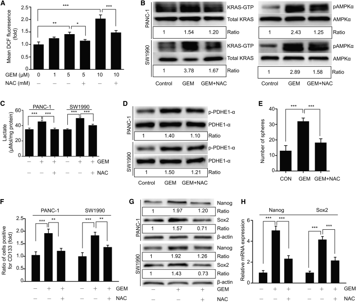 (A) ROS levels were measured using flow cytometry with a DCFH-DA probe in PANC-1 cells pretreated with 5 mM NAC (a ROS scavenger) for 1 h followed by treatment with different doses of GEM for 24 h. (B) Role of ROS in activation of the KRAS/AMPK pathway. PANC-1 and SW1990 cells were pretreated with NAC (5 mM, 1 h) followed by treatment with GEM (5 μM) for 24 h. Activation of KRAS and AMPK were evaluated by western blot. (C) Lactate production by PANC-1 and SW1990 cells pretreated with NAC (5 mM, 1 h) followed by treatment with GEM (5 μM) for 36 h. (D) Levels of p-PDHE1-α in cells treated as in (B) were examined by western blot. Ratios represent the intensity of the p-PDHE1-α band normalized against total PDHE1-α, then normalized against the control. (E–H) Effect of GEM-induced ROS on cancer stemness. (E) PANC-1 cells were treated as in (B). Treated cells were cultured as described. (F and G) CD133 and the pluripotency markers Nanog and Sox2 were examined using flow cytometry (F) or western blot (G) in cells treated as in (B). Ratios were obtained as previously described. (H) qRT-PCR analysis was used to examine mRNA levels of Nanog and Sox2 in PANC-1 cells treated as in (B). β-actin served as an internal control. Ratios represent the intensity of the KRAS-GTP or p-AMPKα bands, normalized against total KRAS or AMPKα, then normalized against controls. GEM, gemcitabine. All experiments were repeated at least three times