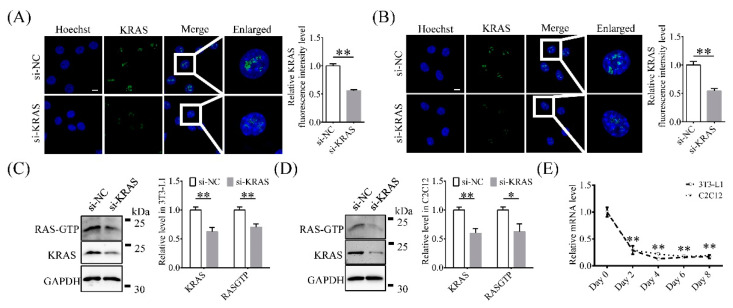 Intracellular localization of Kirsten rat sarcoma 2 viral oncogene homolog (KRAS) and knockdown efficiency determination. (A,B) Representative immunofluorescence images and relative fluorescence intensity levels of KRAS in 3T3-L1 and C2C12 cells with or without KRAS inhibition. Scale bar = 10 μm. Significant differences are represented with ** (p < 0.01). (C,D) Protein levels of KRAS and RAS-guanosine triphosphate (GTP) in 3T3-L1 and C2C12 cells with or without siRNA treatment. Significant differences are represented with * (p < 0.05) and ** (p < 0.01). (E) Relative Kras mRNA expression level changes during adipogenic differentiation in 3T3-L1 and C2C12 cells. Significant differences are represented with ** (p < 0.01).