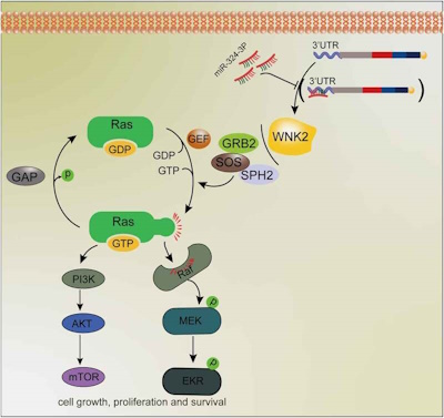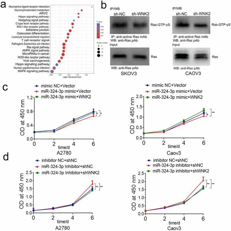 miR-324-3p inhibits OC development by targeting WNK2/RAS pathway. (a) KEGG enrichment analysis of phosphorylation modification proteome profiling. (b) WNK2 knockdown reduced the level of RAS-GTP. (c) WNK2 partly reversed the viability suppression of miR-324-3p on OC cells. (d) WNK2 knockdown partly reversed the tumor promoting roles of miR-324-3p inhibitors on OC cells. ** P < 0.01, *** P < 0.001.