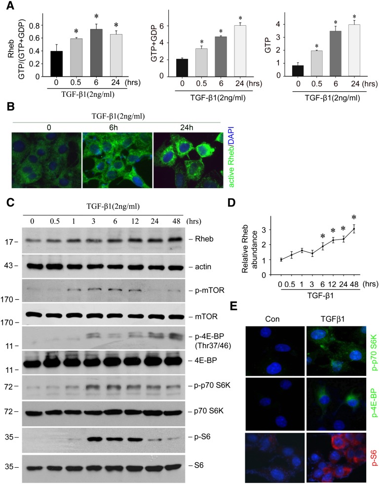 The active GTP-bound Rheb in cultured NRK-49F cells was determined as previously reported.58,59 Briefly, NRK-49F cells were treated with TGFβ1 (2 ng/ml) for the different time points as indicated. Cells were harvested and extracted in an ice-cold HEPES-based buffer containing 10 mM MgCl2, protease inhibitors, and 1% Nonidet P-40. The total Rheb in the extraction was precipitated with the anti-Rheb antibody. After shaking for 16 hours at 4°C, the beads were washed four times with lysis buffer and twice in 20 mM TrisPO4, 5 mM Mg2SO4. The beads were resuspended in 20 mM TrisPO4, 1 mM DTT, and 1 mM EDTA, and heated at 100°C for 3 minutes to elute GTP and GDP bound to the precipitated Rheb. GTP was converted to ATP by a nucleoside diphosphate kinase in the presence of excess ADP with the resulting ATP measured with the ATP Bioluminescent Assay Kit (product number: FL-AA; Sigma-Aldrich). The sum of GTP plus GDP was measured by converting GDP to GTP using pyruvate kinase and phosphoenolpyruvate and then the total GTP, which represents the sum of GDP plus GTP, was measured as described above. The result was presented as the ratio of GTP to GTP plus GDP.