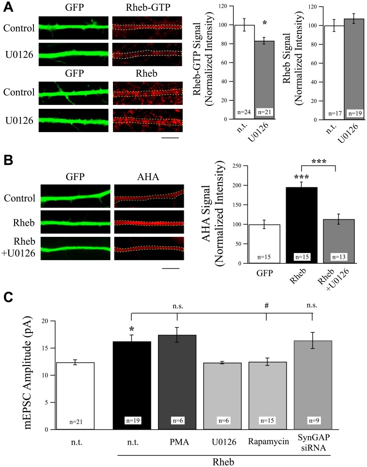 (A) Representative images of neurons stained with anti-Rheb-GTP antibody or total Rheb antibody in the presence or absence of the ERK blocker U0126 (25 µM, 6 hr). U0126 significantly suppressed levels of active Rheb without changing total Rheb levels. Scale bar = 5 µm. (B) Example images and normalized AHA intensity values from experiments using FUNCAT to measure protein synthesis rates. Overexpression of Rheb in cortical neurons produced a significant increase in protein synthesis rates as evidenced by an increase in AHA-labeling rates. This increase in protein synthesis was suppressed by treatment with U0126 (25 µM, 6 hr). Scale bar = 5 µm. (C) Overexpression of Rheb increased mEPSC amplitudes and was recovered by the treatment with U0126 (25 µM, 6 hr) or rapamycin (1 µM, 6 hr). Treatment with PMA (1 µg/ml, 6 hr) did not cause a further increase in mEPSC amplitudes in Rheb overexpressing neurons. Co-expression of Rheb did not produce a further increase in AMPAR-mEPSCs in neurons expressing SynGAPsiRNA
