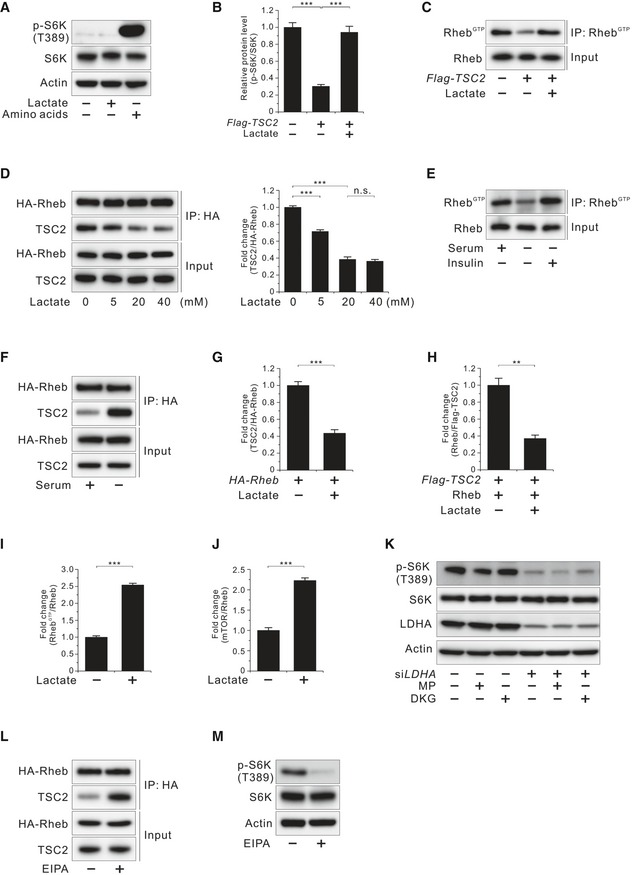 - Molecular interaction between TSC2 and Rheb at the indicated doses of lactate in HA‐Rheb‐overexpressing HCT116 cells after serum deprivation overnight. Data in the bar graphs are the mean ± SEM of three independent measurements. n.s., not significant; ***P < 0.001; unpaired t‐test.