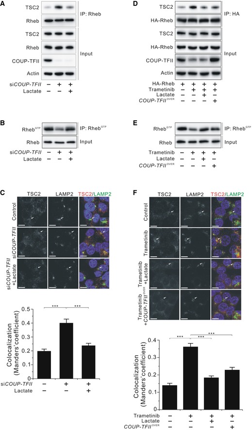 - Molecular interaction between TSC2 and Rheb in the presence or absence of lactate in HA‐Rheb‐ and/or COUP‐TFII‐overexpressing HCT116 cells treated with 25 nM trametinib for 24 h.