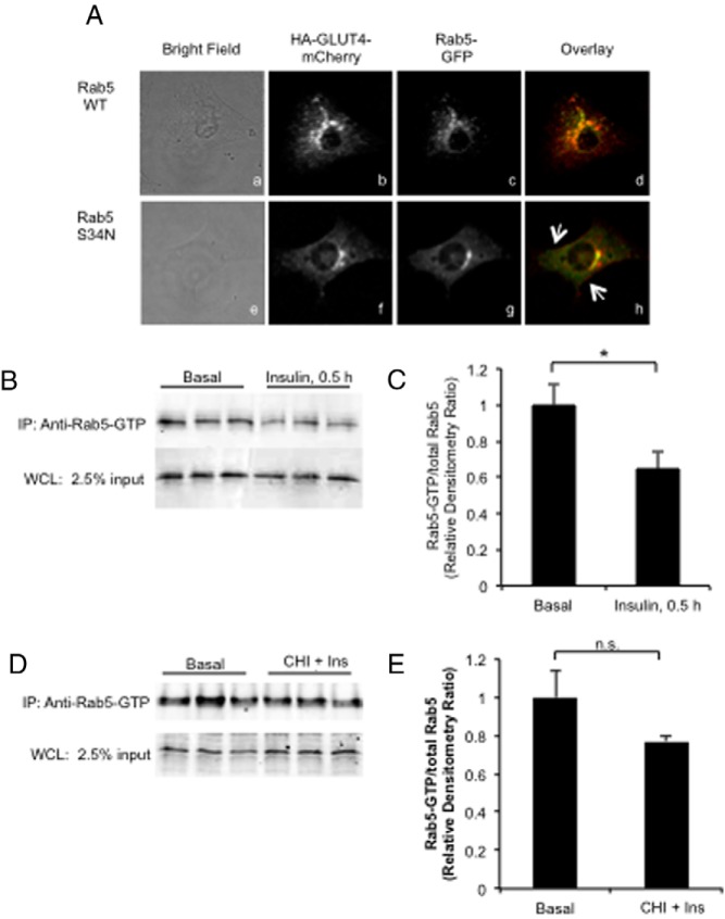 Acute insulin stimulation promotes Rab5 activity-dependent formation of rapid recycling peripheral GLUT4 pool. A, Colocalization of HA-GLUT4-mCherry and GFP-Rab5 WT (panels Aa–Ad) and GFP-Rab5 S34N mutant (panels Ae–Ah) were analyzed by confocal microscopy. The arrows indicate the accumulation of small HA-GLUT4-mCherry vesicles at the margins of the cell (panel Ah). B–E, 3T3-L1 adipocytes expressing Rab5-GTP WT were acutely stimulated with insulin (panels B and C) or treated with CHI followed by restimulation with 10 nM insulin for 30 minutes (panels D and E), and then Rab5-GTP was immunoprecipitated from whole-cell lysates as described in Materials and Methods using a Rab5-GTP-specific antibody. Immunoprecipitated Rab5-GTP was analyzed by immunoblot using antibody against Rab5 as described in Materials and Methods. Representative images from n = 3 are shown. Quantification of Rab5-GTP was reported as mean and SE. All data were analyzed using a Student’s t test. *, P < .05. Ins, insulin; IP, immunoprecipitation; WCL, whole-cell lysate.