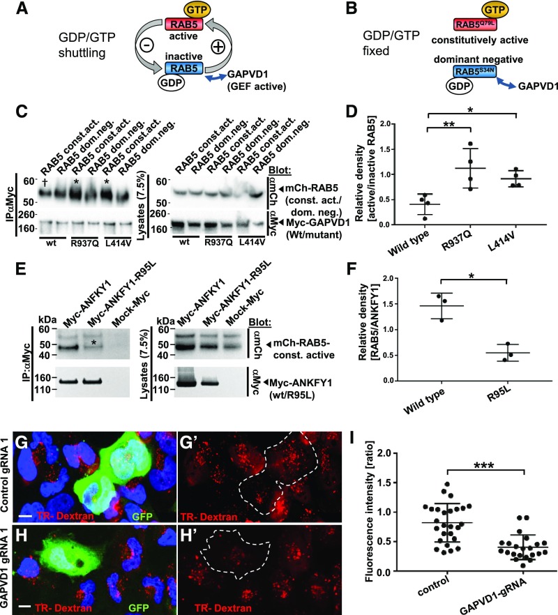 (A and B) Schematic showing that (A) RAB5 shuttles between active and inactive states dependent on binding to GTP/GDP, whereas (B) dominant negative and constitutively active RAB5 constructs are clamped to active and inactive states, respectively. (C) Overexpression and co-IP of mCherry-tagged RAB5 dominant negative (RAB5 dom. neg.) and constitutively active (RAB5 const. act.) constructs together with Myc-GAPVD1 reflecting the wild-type (WT) sequence or mutations causing nephrotic syndrome (R937Q and L414V). WT and mutant GAPVD1 interact with active and inactive RAB5. The mutant constructs of GAPVD1 show a stronger affinity to constitutively active RAB5 (asterisks) compared with WT GAPVD1 († sign). (D) Quantitation of density from precipitates analogous to (C) normalized to respectively precipitated RAB5 construct for co-IPs and shown as a ratio of RAB5 const. act. divided by RAB5 dom. neg. (n=4, P<0.05 or 0.01, respectively). (E) Overexpression and co-IP of mCherry-tagged constitutively active RAB5 together with Myc-ANFKY1 reflecting the WT sequence or the R95L mutation shows strongly reduced amounts of RAB5 precipitating with the mutant ANKFY1 (asterisk), indicating a reduced binding affinity.