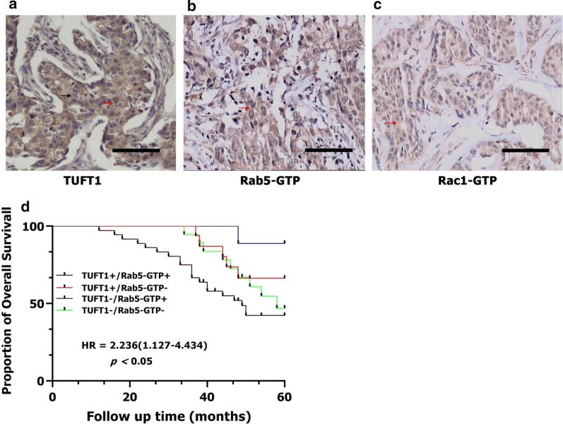 The expression of TUFT1, Rab5-GTP and Rac1-GTP in 80 TNBC patients who had received anthracycline/taxanes chemotherapy after surgery. a–c The positive expression of TUFT1, Rab5-GTP and Rac1-GTP in serial sections. Red arrows indicated cytoplasmic staining; black arrows indicated membrane staining. d Kaplan–Meier survival curves showing survival in 80 patients who received chemotherapy blotted in relation to TUFT1 and Rab5-GTP expression. Survival curves showing the poor overall survival in patients with tumors co-expressing TUFT1 and Rab5-GTP that received chemotherapy