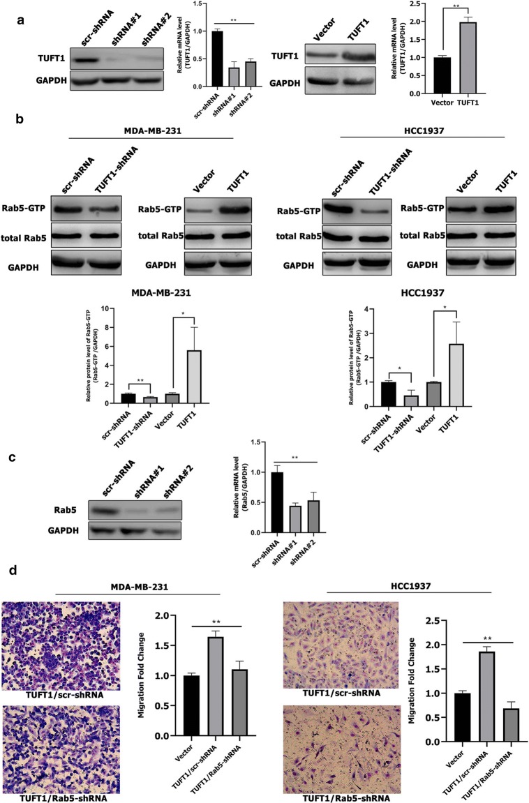 TUFT1 can regulate the Rab5 activation. a TUFT1 protein and mRNA expression levels were examined by western blotting and qPCR in MDA-MB-231 cells after infection with lentivirus containing TUFT1-shRNA or pLNCX2-TUFT1. b TUFT1 expression was downregulated by TUFT1-shRNA and upregulated by PLNCX2-TUFT1 in MDA-MB-231 and HCC1937 cells. Rab5-GTP expression was examined by western blotting (n = 3). c Rab5 protein and mRNA expression levels were examined by western blotting and qPCR in MDA-MB-231 cells after infection with lentivirus containing Rab5-shRNA or scr-shRNA. d Rab5-shRNA or scr-shRNA were transfected into TUFT1-overexpressing MDA-MB-231 and HCC1937 cells. Cell migration was monitored by transwell assay (n = 3). Results are presented as mean ± SD. The statistical significance was assessed by student’s t test; *p < 0.05, **p < 0.01