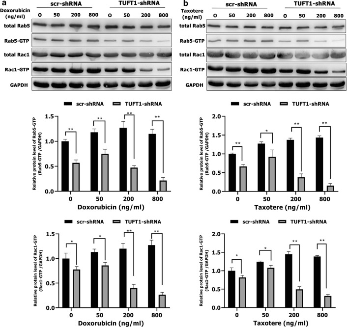 TUFT1 promotes TNBC cell resistance to chemotherapy by upregulating the Rab5/Rac1 pathway. a, b MDA-MB-231 cells were transfected with TUFT1-shRNA or scr-shRNA following treatment with various doses of doxorubicin and Taxotere for 24 h. Levels of Rab5, Rab5-GTP, Rac1 and Rac1-GTP were examined by western blotting in MDA-MB-231 cells (n = 3). Results are presented as mean ± SD. The statistical significance was assessed by Student’s t-test; **p < 0.01