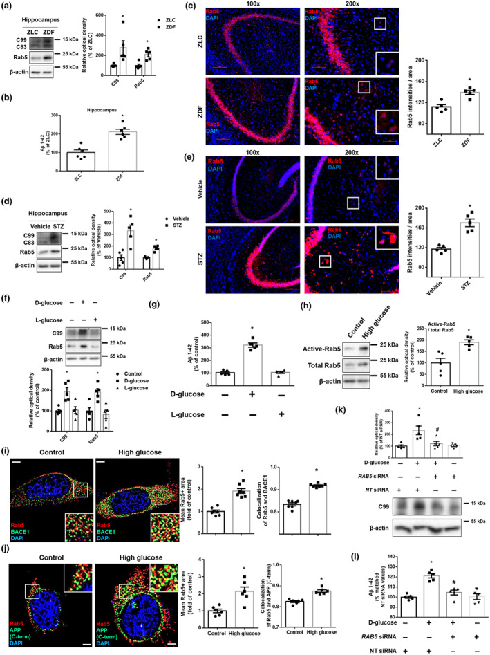 (h) The cells were treated with high glucose (25 mM) for 24 h. Active Rab5 (GTP‐bound Rab5) was immunoprecipitated with Rab5‐specific antibody (upper panels). Expression of Rab5 and β‐actin in total lysate is shown in the middle and lower panels. n = 5 from independent experiments.