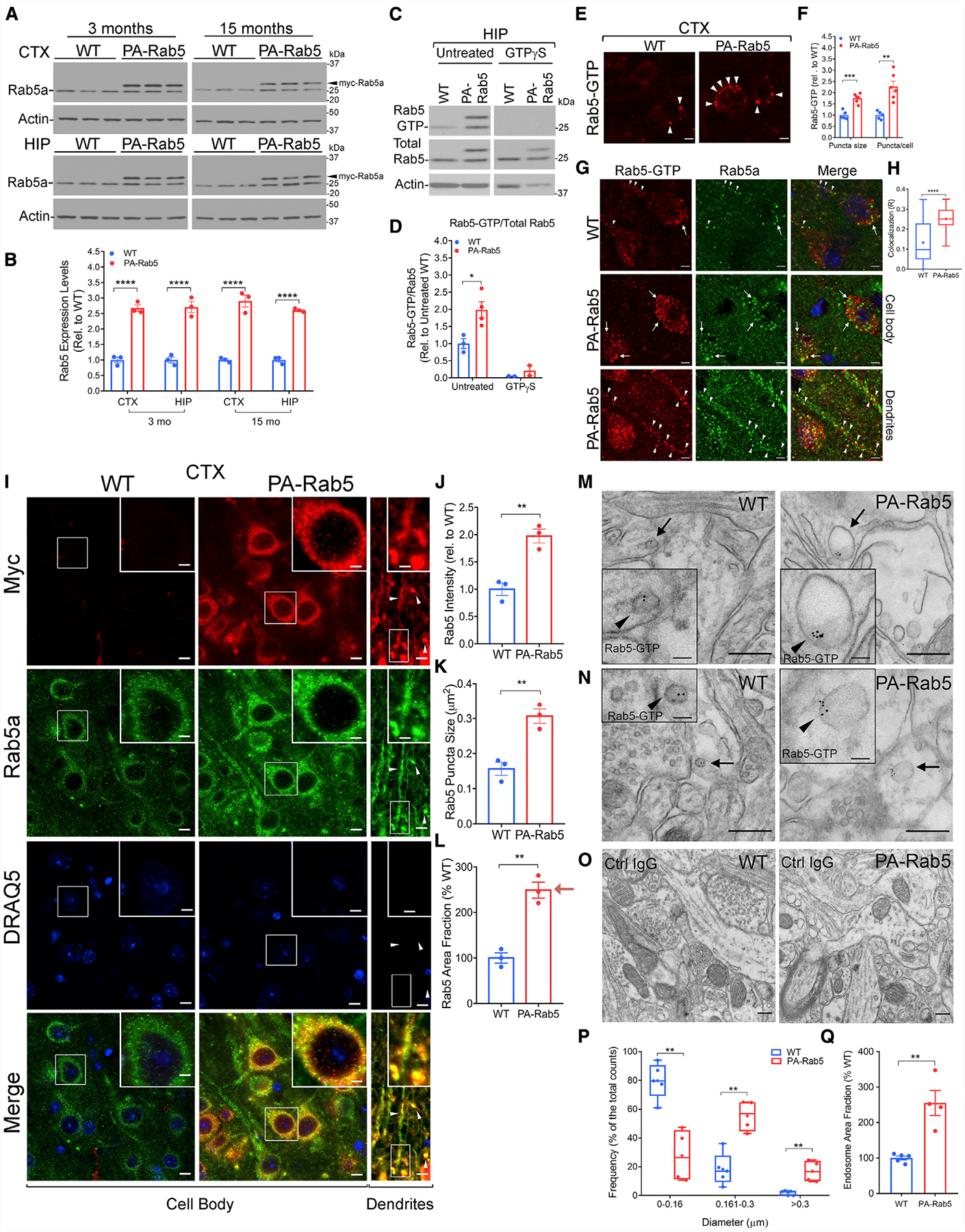(E and F) Representative confocal images (E) and quantification (F) of activated Rab5 in the CTX at 7 months. Rab5-GTP puncta (arrowheads) size and number per cell are increased in PA-Rab5, compared to WT (WT n = 5; PA-Rab5 n = 6). Scale bars, 5 μm.