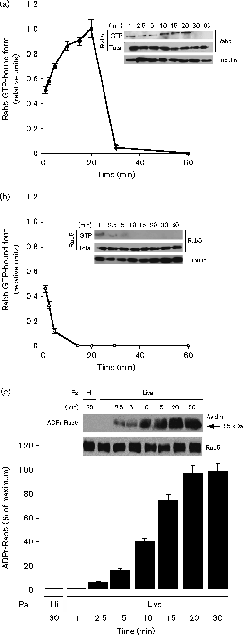 (•, a) or live (○, b) P. aeruginosa for various times (1 to 60 min) at 37 °C. Endogenous GTP-bound activated Rab5 was analysed by immunoblotting. The insets show representative immunoblots of samples probed with anti-Rab5 antibodies for total Rab5 and active Rab5, and with anti-tubulin antibodies (the control for total protein in the cell lysate). (c) ADP-ribosylation of endogenous Rab5 during phagocytosis of P. aeruginosa. Macrophages expressing vector alone were incubated with biotin-NAD supplemented media followed by infection with heat-inactivated (Hi) or live P. aeruginosa for various times (1 to 30 min) at 37 °C. Cells were then washed with ice-cold PBS, lysed and incubated with anti-Rab5 mAbs, followed by incubation with protein A/G agarose beads. After incubation, the beads were washed and Rab5 was analysed by immunoblotting with anti-Rab5 antibodies and avidin as described in Methods. Data represent the mean ± sem of three independent experiments. ADPr-Rab5, ADP-ribosylated Rab5; Pa, P. aeruginosa.