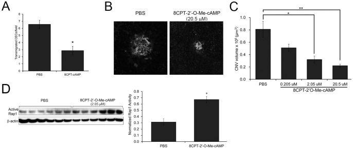 CEC transmigration across RPE monolayer (in vitro) and CNV volume (in vivo) are inhibited with 8CPT-cAMP treatment.
