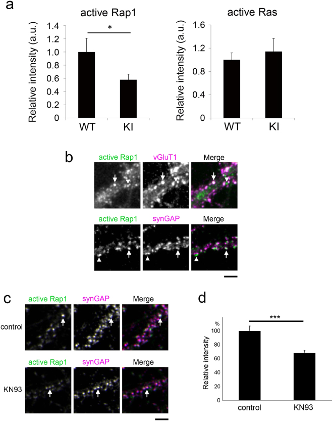 (a) Quantification of active Rap1 and active Ras immunoreactivity in the dendrites of CaMKIIα KI or wild-type neurons. Data are presented as the mean ± SEM, (neurons at 21–22 DIV, Rap1; n = 42 and 27 cells from 4 independent cultures of wild-type and CaMKIIα KI hippocampi, Ras; n = 32 and 33 cells from 5 independent cultures of wild-type and CaMKIIα KI hippocampi), *p < 0.05, t-test. (b) Immunoreactivity of active Rap1 in the dendrites of hippocampal neurons at 22–23 DIV and immunostaining for the presynaptic marker vGluT1 or the postsynaptic marker synGAP. Active Rap1-positive punctae are either colocalized with (arrows) or separated from (arrowheads) the synaptic markers. Bar, 5 µm. (c) Immunocytochemistry of KN93-treated neurons exposed to the anti-active Rap1 antibody. The intensity of active-Rap1 punctae at synGAP-positive postsynaptic sites was lower in neurons treated with KN93 (arrows). Bar, 5 µm. (d) Quantification of active Rap1 immunoreactivity at synGAP-positive postsynaptic sites indicates that Rap1 activity is negatively regulated by KN93. Data are presented as the mean ± SEM, (neurons at 20–22 DIV, n = 22 cells from 3 independent cultures for both control (KN92) and KN93 treatment), ***p < 0.001, t-test.