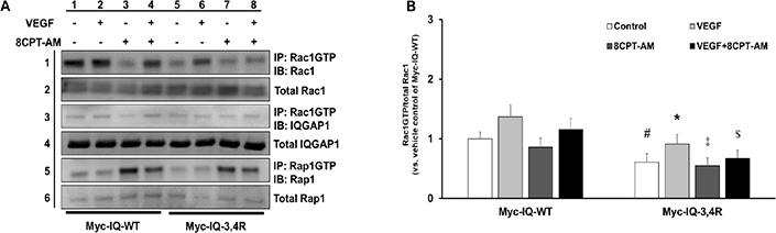 A) Representative western blot images that depict Rac1 activation by immunoprecipitation of Rac1GTP and blot of total Rac1 (row 1), total Rac1 (row 2), GFP-tagged IQGAP1 plasmid construct (i.e., either GFP-IQ-WT or GFP-IQ-ΔIQ) interactions with Rac1 by co-immunoprecipitation (row 3), GFP-tagged IQGAP1 pulled down by immunoprecipitation as loading control (row 4), Rap1 activation by immunoprecipitation (row 5), and total Rap1 (row 6) in lysates from CECs transfected with GFP-IQ-WT (columns 1–4) or GFP-IQ-ΔIQ (columns 5–8) and treated with 0.05% DMSO or 8CPT-AM (1 μM) in the presence VEGF (50 ng/mL) or PBS; B) Quantification of Rac1 activation by densitometry analysis (Normalized mean±SEM, †p<0.05 vs. Control of GFP-IQ-ΔIQ, *p<0.05 vs. VEGF of GFP-IQ-WT, ‡p<0.05 vs. 8CPT-AM of GFP-IQ-WT, $p<0.05 vs. VEGF+8CPT-AM of GFP-IQ-WT, n=3 per group from 3 independent experiments); C) Representative confocal images of CECs labelled to identify GFP tagged IQGAP1 (green), Rap1GTP (red), and DAPI (blue) in response to 1 μL PBS and 0.05% DMSO (control), 50 ng/mL VEGF and 0.05% DMSO (VEGF), 1 μL PBS and 1 μM 8CPT-AM (8CPT-AM), or 50 ng/mL VEGF and 1 μM 8CPT-AM (VEGF+8CPT-AM); D) Quantification of Rap1GTP fluorescent density in response to treatments described in Fig. 3C (Normalized mean±SEM, **p<0.05 vs. Control of GFP-IQ-WT, ††p<0.05 vs. Control of GFP-IQ-ΔIQ, n=3 per group from 3 independent experiments)