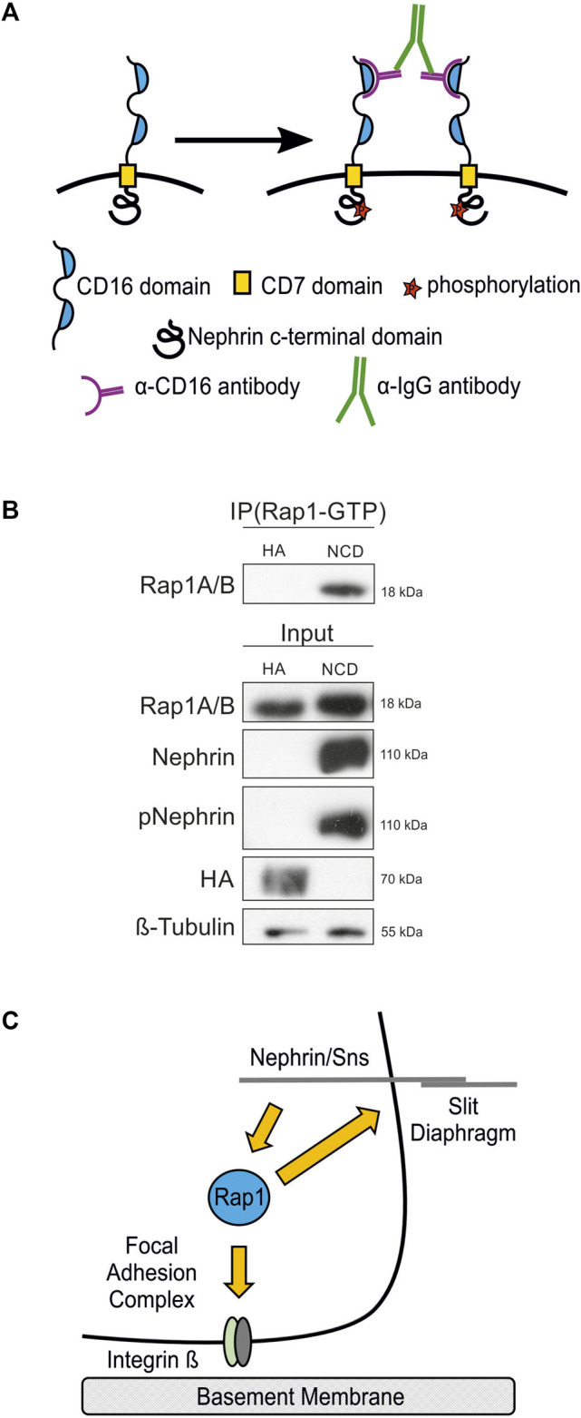 (A) A nephrin clustering assay was performed by adding anti-CD16 antibody and secondary anti-IgG antibody to the media of cultured podocytes, which induces clustering of nephrin proteins followed by recruitment of Src kinases and consecutive phosphorylation of nephrin on tyrosine residues. (B) Immunoblot with antibodies specific for Rap1A/B following immunoprecipitation (IP Rap1-GTP) with an antibody specific for active Rap1A/B of podocyte lysates. Employed were human podocyte lines that inducibly express either chimeric CD16-CD7-nephrin cytoplasmic domain (NCD) or CD16-CD7-HA (HA) as a control following doxycycline treatment followed by clustering of nephrin. Immunoblots of these lysates were also performed with antibodies specific for Rap1A/B, nephrin, phospho-nephrin (pNephrin), HA, and β-tubulin (Input), n = 3. (C) Schematic of the hypothesis that the small GTPase Rap1 functions downstream of nephrin in signaling to integrin β at focal adhesions and in signaling at the slit