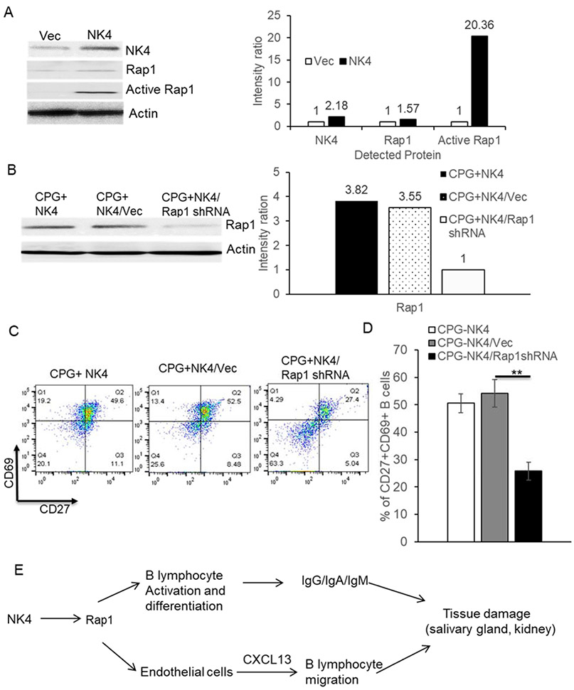 (A) Naïve B cells were transfected with empty vector or NK4, NK4 and Rap1 protein were measured using western blotting. For detection of Rap1 activity, the protein was measured with activated Rap1 antibody, after IP, according to the Rap1 activity measuring protocol. The band intensities of WB were analyzed using imageJ software. The intensity ratios were calculated. (B) Rap1 protein was detected via western blotting, after naïve B cells were transfected with NK4 in the presence of empty shRNA or Rap1a shRNA for 6 days. Both representative WB results and their band intensity ratios were shown. (C) CD69 and CD27 expression on B cells above (B) were also measured. (D) graph data are from three independent experiments. *, P<0.05, **p<0.01. (E) One diagram of putative signaling pathway, by which NK4 regulates B cell differentiation and further induce autoimmune phenotypes such as tissues damage via upgrading Rap1 activity.