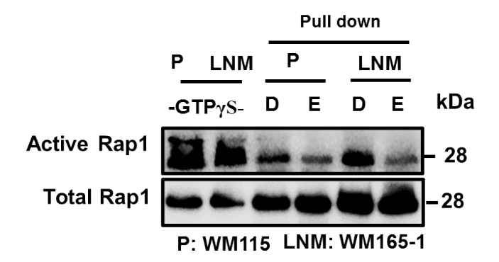 Total cell lysates (500µg protein) of WM115 and WM165-1 were treated with the GTPγS (non-hydrolyzable GTP). The lysates were then incubated with GST-RalGDS-RBD to pull down GTP-bound RAP1. (30µL eluted samples and 30µg of total cell lysate were subjected to SDS-PAGE (15% acrylamide) and probed with ant-active RAP1 antibody (New East Biosciences Inc., Mavern, PA).